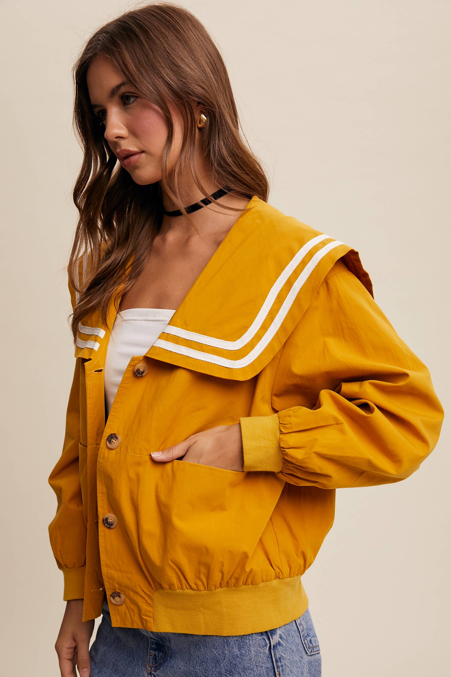 about: a modern twist on vintage prep, this lightweight sailor-collar jacket blends playful nautical charm with everyday versatility. crafted from breathable cotton-blend fabric and finished with thoughtful details, it’s perfect for layering over denim, skirts, or dresses for an effortlessly chic look.