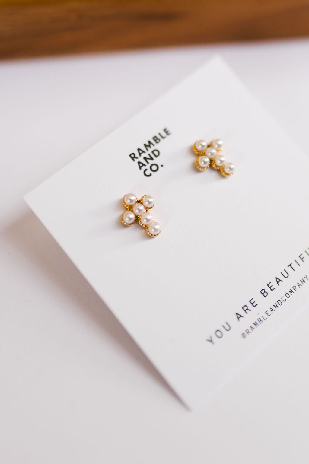 about: simple, polished, and a little celestial — this pearl cross stud adds a soft glow to any look. the combination of a luminous faux pearl and 18k gold shine gives it a timeless feel, while the petite size keeps things sweet and effortless. delicate enough for everyday, special enough for dressing up, and totally worry-free for sensitive ears.