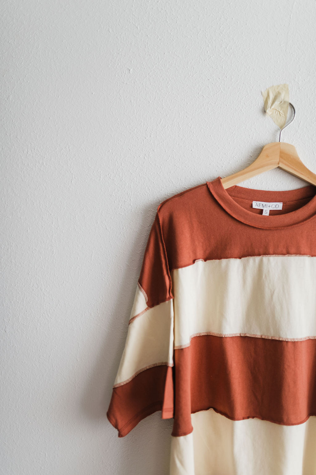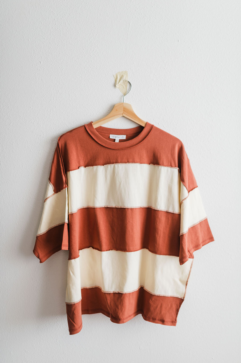 design: this relaxed-fit t-shirt features bold butter and terracotta stripes with exposed seams for a casual, effortless vibe.