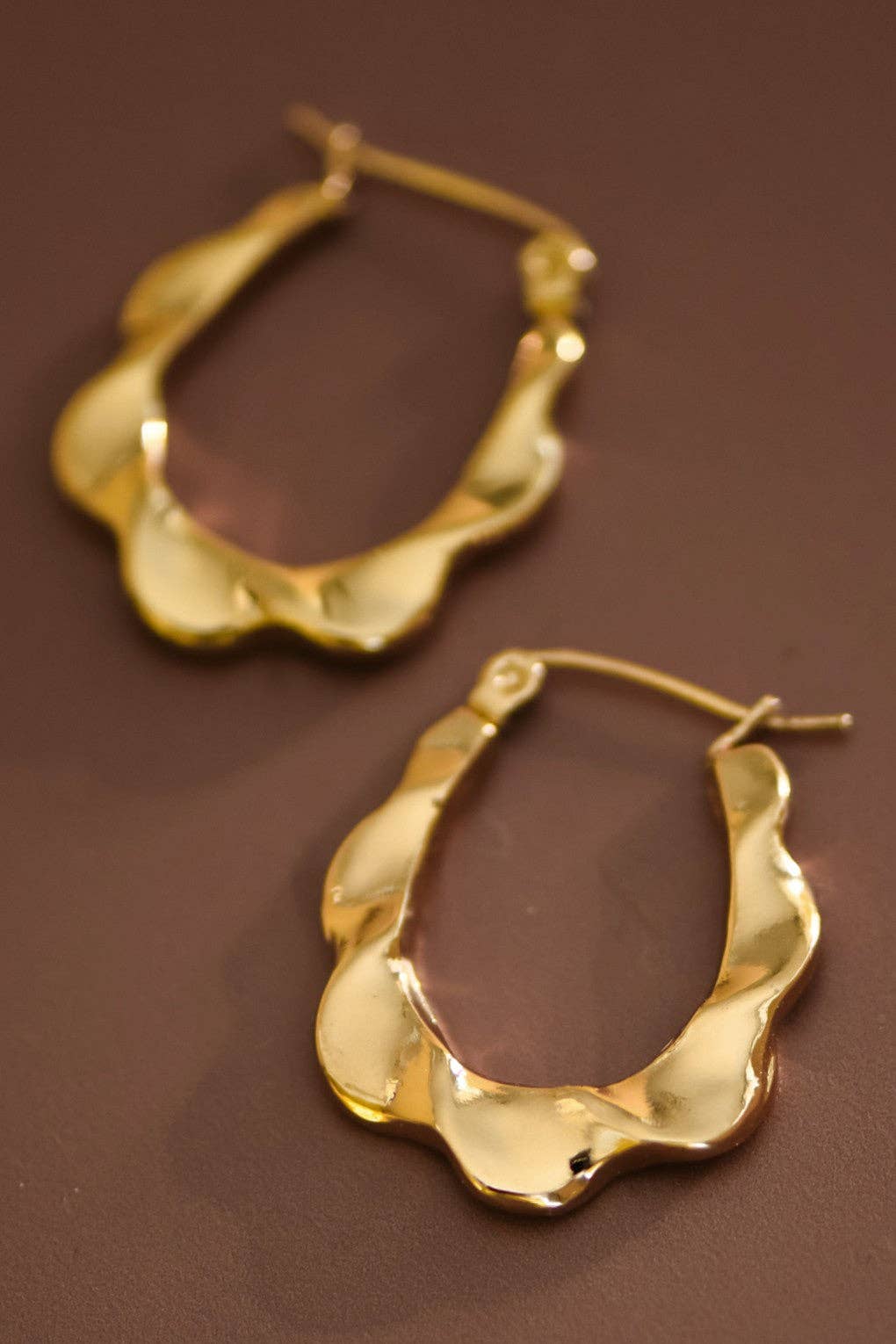 about: modern and playful, these wave-shaped hoop earrings feature a secure clasp and a sleek, minimalist design. Made from 18K gold-plated stainless steel, they are hypoallergenic, waterproof, and tarnish-resistant, perfect for everyday wear or layering with other pieces. 1"