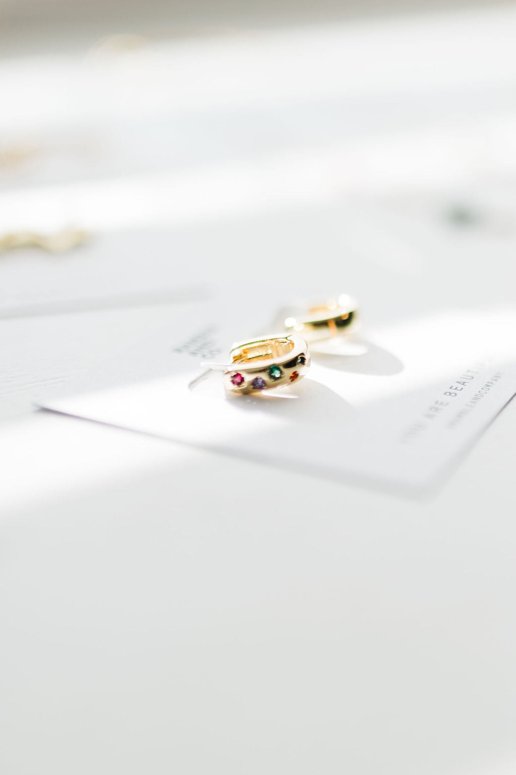 design: Brighten up your everyday look with these gold-filled huggie earrings, featuring a row of sparkling colorful diamonds. Fun, vibrant, and perfect for stacking or wearing solo!