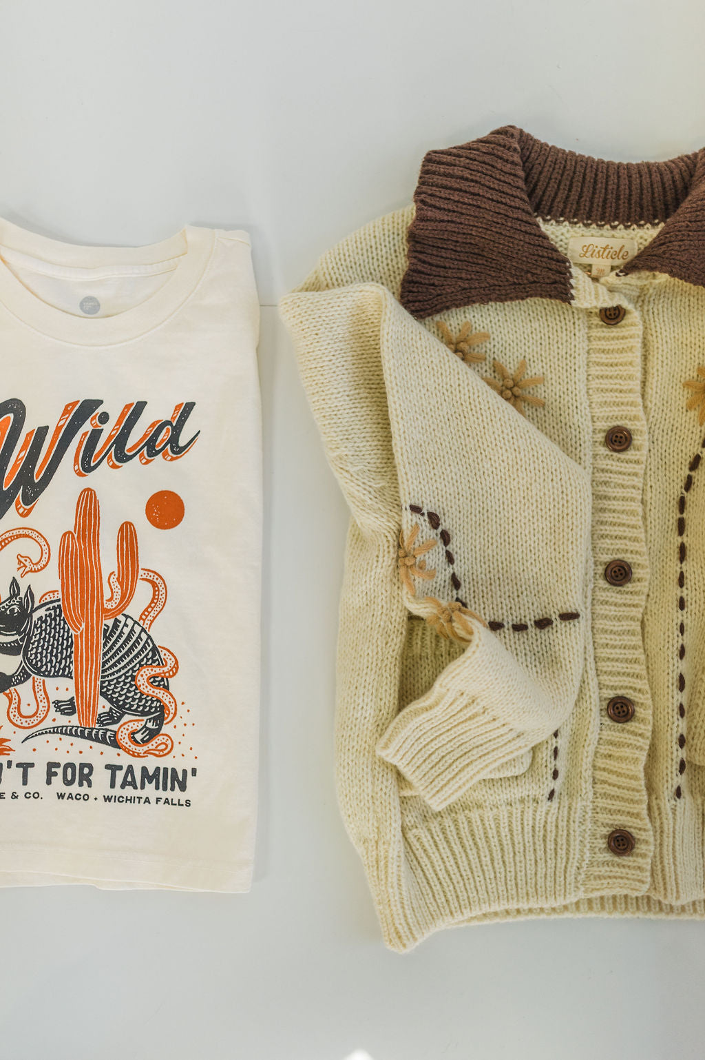 about: this cardigan is pure cozy magic — a little boho romance, a little western charm, and a whole lot of personality. the oversized contrast collar gives it that standout, slightly dramatic edge, while the floral embroidery and stitched swirls feel like something hand-found on a road trip treasure hunt. it’s warm, relaxed, and ready to make any outfit feel instantly more special, whether you’re twirling in a midi dress or keeping it casual in denim.