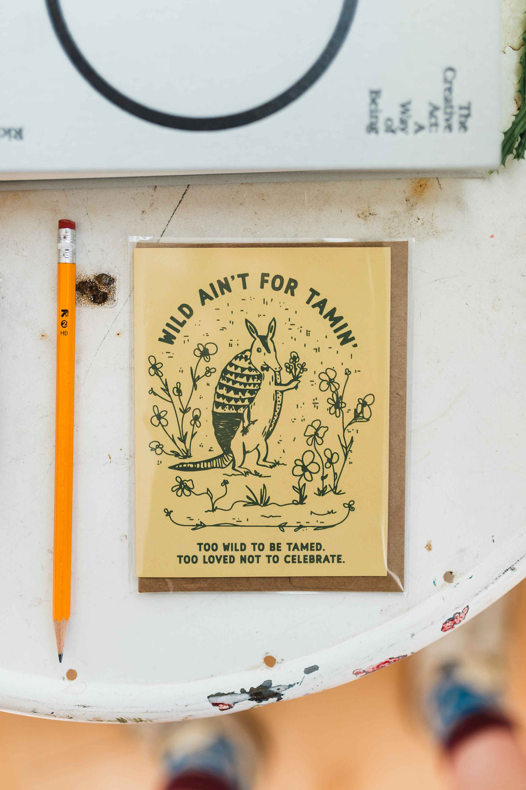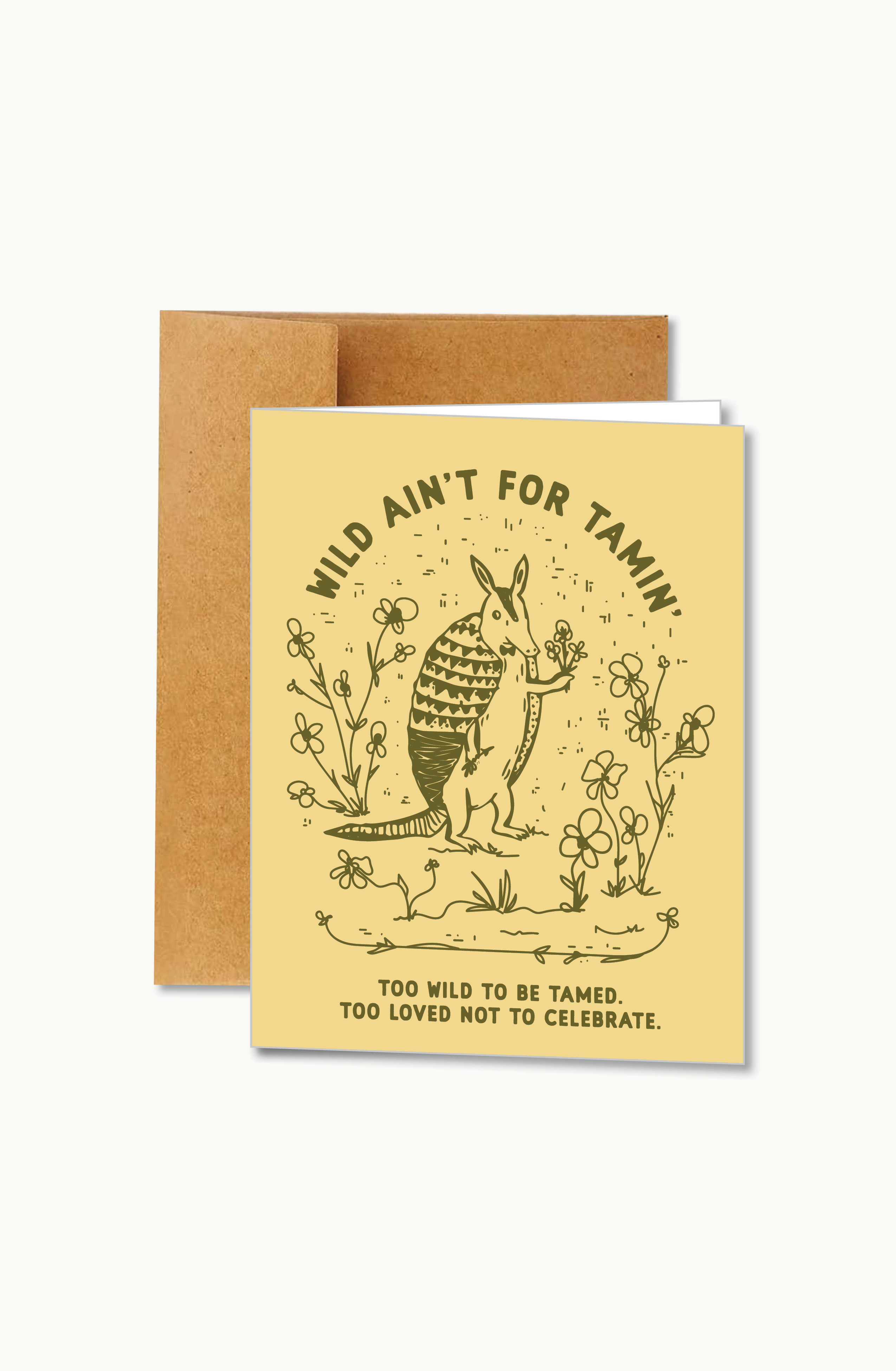 This card features an armadillo holding flowers paired with the phrase “wild ain’t for tamin. too wild to be tamed. too loved not to celebrate” perfect for the friend who is unapologetically herself and exactly how she’s meant to be.