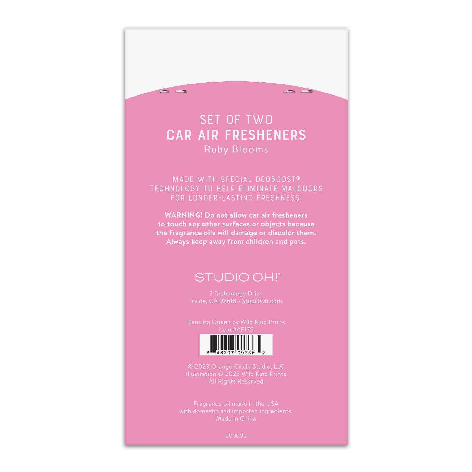 about: Make your drive time more pleasant with colorful car air fresheners from Studio Oh! These fragrance-infused designs help eliminate malodors and create long-lasting freshness in your vehicle. With two car air fresheners per package, you can mix and match designs between cars or keep a spare tucked in your glove box. • Hangs by an elastic band with a decorative wooden bead • Includes a scent-test sticker on each package • Showcases colorful artwork