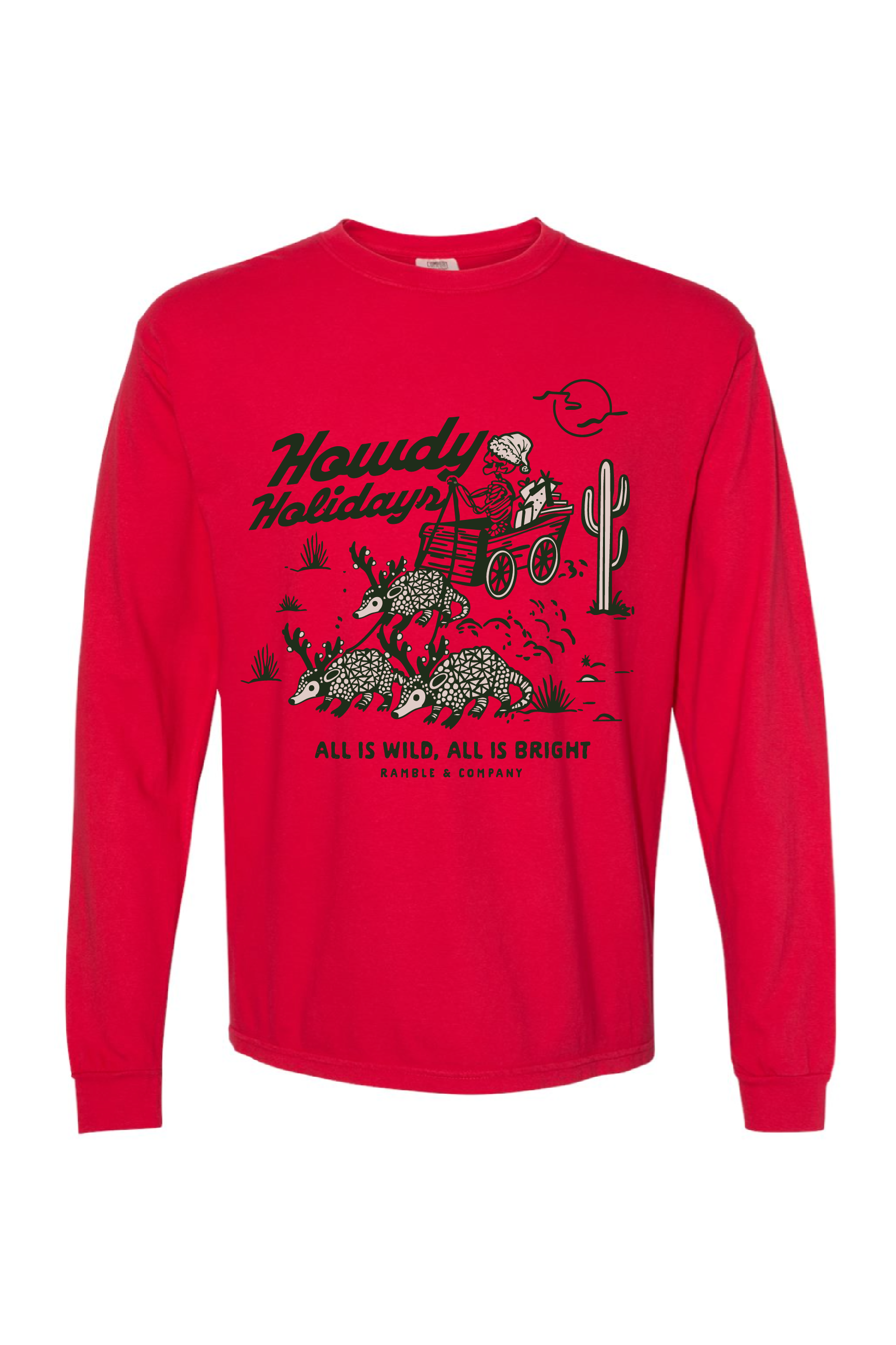 Three armadillos + Skeleton Santa + a wagon full of gifts = peak holiday joy.