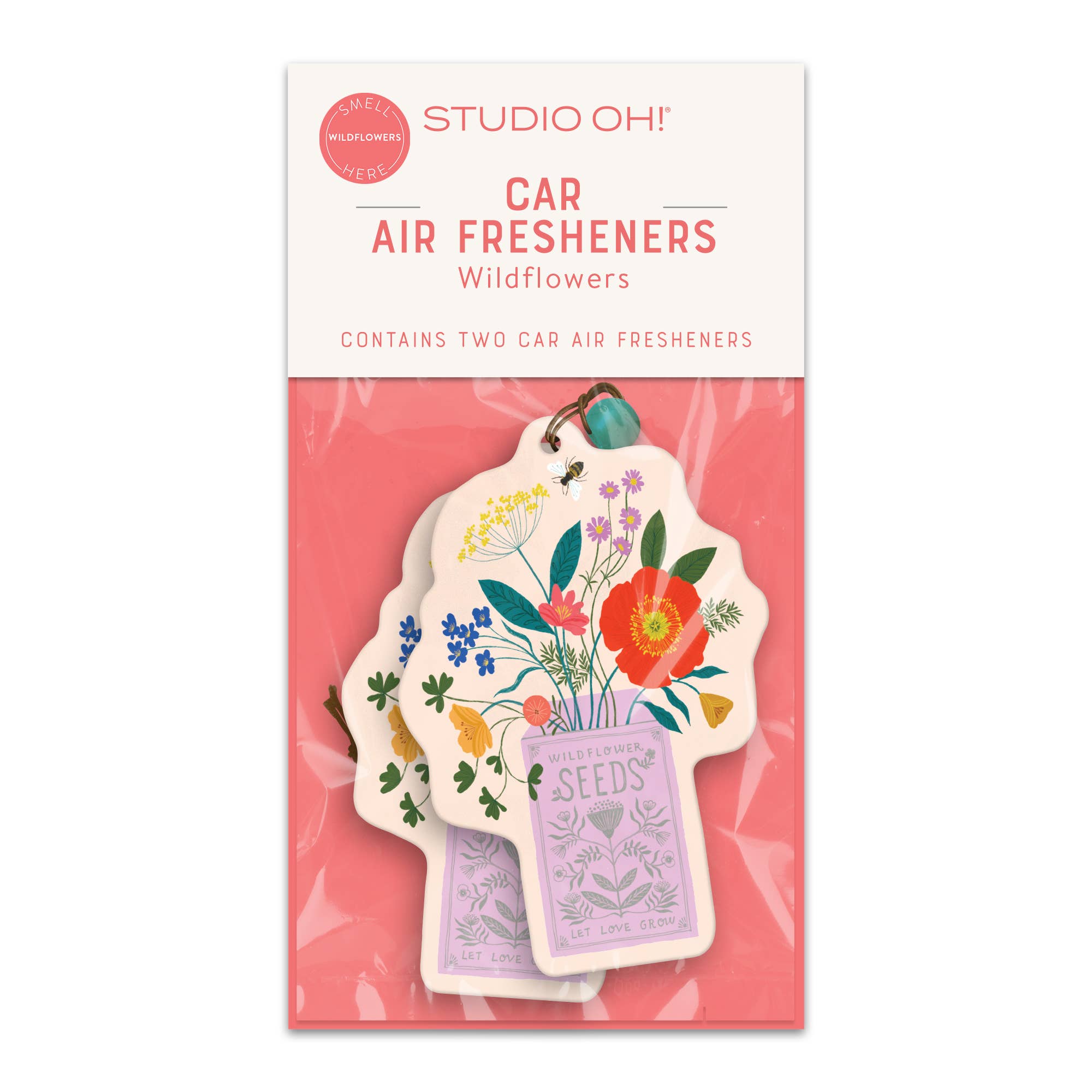 about: Make your drive time more pleasant with colorful car air fresheners from Studio Oh! These fragrance-infused designs help eliminate malodors and create long-lasting freshness in your vehicle. With two car air fresheners per package, you can mix and match designs between cars or keep a spare tucked in your glove box. • Hangs by an elastic band with a decorative wooden bead • Includes a scent-test sticker on each package • Showcases colorful artwork