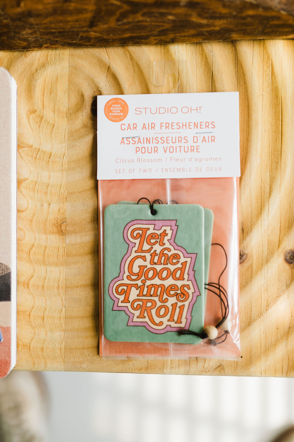 about: Make your drive time more pleasant with colorful car air fresheners from Studio Oh! These fragrance-infused designs help eliminate malodors and create long-lasting freshness in your vehicle. With two car air fresheners per package, you can mix and match designs between cars or keep a spare tucked in your glove box. • Hangs by an elastic band with a decorative wooden bead • Includes a scent-test sticker on each package • Showcases colorful artwork